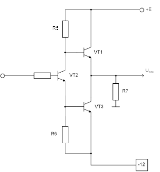 Так як кінцевий каскад виконаний по схемі зі спільним колектором, то
