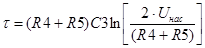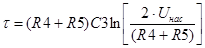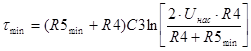 а отже тривалість імпульсу вихідного сигналу залежить від опорів R4 R5 один з яких досліджуваний. Можливі межі тривалості розрахуємо після того, як будуть обрані всі елементи.