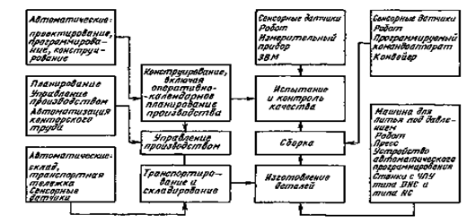 Таким образом, автоматизированный (автоматический) завод как комплексная производственная система состоит из аппаратных элементов (технологических, транспортных, управляющих, вычислительных и др.) и математического обеспечения, которые включают средства для проектирования продукции, ее изготовления, производственного планирования и контроля. Функционирует завод в три смены, причем во вторую и третью смены с ограниченным персоналом.