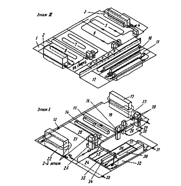 Этаж : 1 - Служба завода; 2 - диспетчерская АСУ завода; 3 - склад цеха консервации и упаковки; 4 - участок нанесения компаунда; 5 - цех консервации и упаковки продукции; 6 - участок окраски изделия в сборе; 7 - участок окраски литых деталей; 8 - участок окраски штампосварных деталей; 9 — вспомогательные производственные участки; 10 — электромонтажный цех; 11 - участок входного контроля узлов; 12 - конторские и бытовые помещения. Этаж /: 13 — склад комплектующих изделий и деталей; 14 — склад комплектующих участка узловой сборки; 15 — склад участка сборки и общего монтажа станков; 16 — склад длинномерных изделий; 17 — склад № 2 деталей и заготовок; 18 — участок испытания станков; 19 - участок сборки и общего монтажа станков; 20 - ГАУ обработки тел вращения; 21 — ГАУ обработки станин; 22 — склад № 1 деталей и заготовок; 23 - склад станин; 24 — конторские и бытовые помещения служб завода; 25 — участок сборки электрошкафов; 26 - выходной поток готовой продукции; 27 - участок нанесения эпоксидного компаунда; 28 - лифты грузоподъемностью 20 т между первым и вторым этажами; 29 - выходной поток упакованной продукции; 30 - входной поток готовых деталей, материалов и комплектующих изделий, отправляемых заказчику в качестве комплектации оборудования; 31 - входной поток деталей, материалов, заготовок и комплектующих для изготовления и сборки станков; 32 - промежуточный склад комплектующих изделий и деталей; 33 — входной поток станин, крупногабаритных заготовок и деталей; 34 - ГАУ обработки ответственных деталей шпиндельных узлов; 35 — термоконстантный участок; 36 - участок общего монтажа и испытания станков; 37 - участок распаковки и расконсервации поступающих на завод заготовок и комплектующих; 38 - участок финишной обработки ответственных деталей