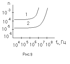 На рис.9 показаны типичные зависимости коэффициента потерь от тактовой частоты дл рассмотрения выше элементов ПЗС с поверхностным переносом для рассмотренных выше элементов ПЗС с поверхностным переносом зарядовых пакетов 1 и с объемным переносом 2 ( см.3 ) Потери зарядового пакета при переносе на высоких тактовых частотах в основном вызваны тем, что малое время, отводимое на пернос, часть электронов не успевает переместиться в соседний элемент и остается в предыдущем. Эти потери резко увеличиваются с ростом тактовой частоты, т.е. при уменьшении интервала времени, отводимого на перенос.