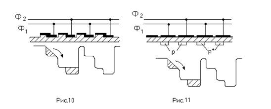 Приборы с асимметричными элементами ( см.10 и 11) могут работать и при использовании одной шины управляющих импульсов. При этом на вторую шину подается постоянное напряжение, уровень которого находится посередине между высоким и низким уровнями напряжения. Схемы управления такими приборами намного проще, однако амплитуда управляющих импульсов должна быть приблизительно вдвое больше, чем в двухтактных ПЗС.