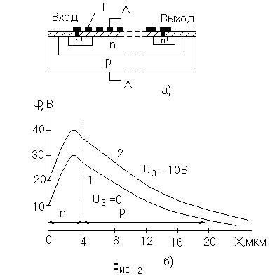 Распределение потенциала в вертикальном направлении по сечению А-А структуры показано на рис.12, б ( кривая 1). Координата х отсчитывается от поверхности полупроводника. Распределение потенциала имеет максимум на глубине х = 3 мкм, т.е. внутри n- cлоя. Он соответствует минимуму потенциальной энергии электронов. Электроны, введенные в такую структуру, будут смещаться электрическим полем к области с минимальной потенциальной энергией. Следовательно, аналогично структуре с поверхностным каналом переноса эта структура способна накапливать и хранить зарядовые пакеты в потенциальных ямах под затворами. В отличие от ПЗС с поверхностным каналом переноса здесь в потенциальных ямах, расположенных в n-слое, накапливаются основные носители – электроны.