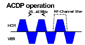 Метод ACDP (AdjacentChannelDualPolarized) припускає використання різних частот сигналів (сусідніх або суміжних по частотній сітці) на ортогональній поляризації. Тому його практична реалізація простіша в технічному і алгоритмічному стосунках, а розв'язка між сигналами різної поляризації додатково підвищується за рахунок частотно-селективної дії амплітудно-частотних характеристик частотних фільтрів. Проте при OFDM- методі модуляції сигналів технологія ACDPне дозволяє ефективно використовувати відведений спектральний діапазон, стикаючись з необхідністю розстановки що піднесуть в ортогональній поляризації в шаховому порядку.