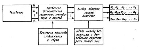 Метод основан на том, что по характеру отличия выходного параметра телевизора уг от нормы выбирают из всего множества элементов X подмножество X', в котором могут находиться дефекты, приводящие к данному внешнему проявлению Х'∩Х. Иными словами, подмножество X' соответствует тому участку телевизора, где наиболее вероятен дефектный элемент.