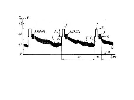 Рис.4. Полный цветовой телевизионный сигнал отрицательной полярности.
