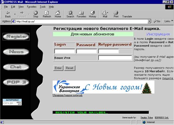 http://mail.zp.ua Для тех, кто живет в Украине. Сервер расположен в Запорожье. Стабильно работает вот уже полгода!!! Вы получаете E-Mail адрес <ваш адрес@mail.zp.ua> Размер получаемого почтового ящика 5Mb. Доступ по протоколу POP3 и через браузер.