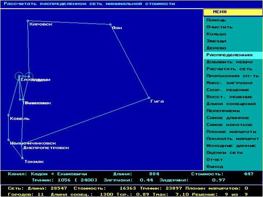 Проектирование выполнялось в два этапа: проектирование региональных сетей передачи данных и проектирование горизонтальной сети передачи данных, которая объединяет отдельные региональные сети в одну единую. На последнем этапе была полученная конечная карта распределенной информационно-вычислительной сети, которая, представляет из себя симбиоз топологий, и которая является самой оптимальной по главному критерию общей стоимости сети и обеспечивает 100% эффективность по сравнению с остальными вариантами разработанных топологий.