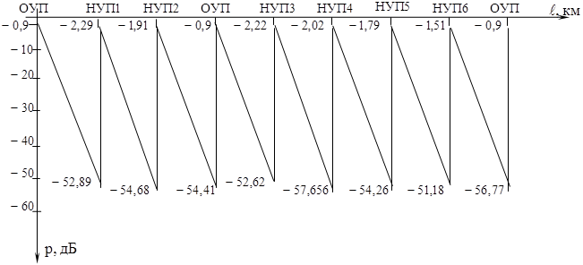 Обслуживаемый усилительный участок ставим между вторым и третьим необслуживаемыми усилительными участками. Обслуживаемый усилительный участок выбирается с двухчастотной автоматической регулировкой усиления (линия короткая). Разбиваем секцию ОП-ОУП на усилительные участки, длина усилительного участка: