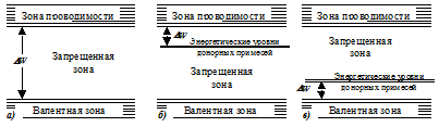 Рисунок 1.1. Энергетические зоны полупроводника: а – чистого, б – п-типа, в – р-типа