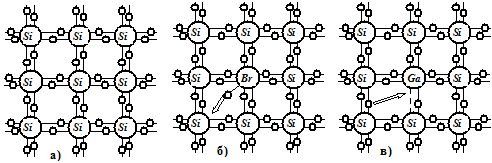 Рисунок 1.2. Ковалентная связь атомов в полупроводниковом кристалле кремния: а – чистый полупроводник; б – с донорной примесью; в – с акцепторной примесью.