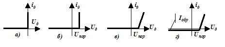 Наиболее широко используется первая идеализация: обратный ток и падение напряжения на прямосмещенном диоде равны нулю (рисунок 1.7, а). Погрешности идеализации максимальны: для германиевых диодов при обратных напряжениях; для кремниевых – при прямых. Желание учесть пороговое напряжение, увеличение падения при увеличении прямого тока, наличие обратного тока приводят к более сложным видам идеализированных ВАХ (рисунки 1.7, б, в, г).