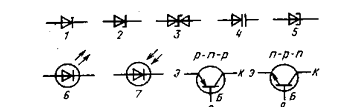 Рисунок 1.8. Условные графические обозначения полупроводниковых приборов: 1 – выпрямительный и импульсный диод; 2 - стабилитрон и стабистор; 3 – симметричный стабилитрон; 4 – варикап; 5 – туннельный диод; 6 – излучающий диод; 7 – фотодиод: 8 – биполярный транзистор p-n р-типа; 9 – биполярный транзистор n p-n типа.