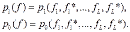Пусть принятый сигнал f(t) характеризуется плотностью вероятности p1(f) при условии А1 и плотностью вероятности p0(f) при условии A0. Если вместо непрерывной функции f(t) рассматривать L дискретных значений £1, f2, …, fL то функции p1(f) и p0(f) являются 2L - мерными распределениями вероятностей, что более подробно следует записать так: