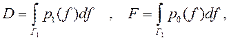 Учитывая введённые определения и обозначения, получаем соотношения для вероятностей правильного обнаружения и ложной тревоги