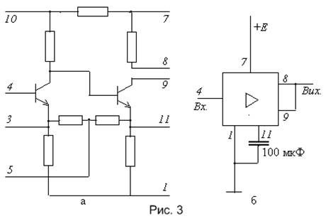 Перші ІМС з'явились у 60-х роках. Вони мали зовсім невисокий ступінь інтеграції – до їх складу входило лише кілька (не більше десяти) транзисторів та резисторів. Прикладом такої простої ІМС може бути двокаскадний підсилювач низької частоти типу К122УНІА, принципова схема якого зображена на рис.3а, а на рис.3б дана схема його включення[3] .
