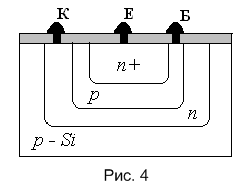 У описаній вище (п.7.1) планарній технології колектор біполярного транзистора утворюється з тієї частини напівпровідникової підкладки, якої не торкнувся технологічний процес. Однак, в інтегральній мікросхемі подібна ситуація неприпустима, оскільки колектори всіх транзисторів мікросхеми виявилися б сполученими між собою через спільну підкладку. Тому в ІМС необхідно передбачити ізоляцію колектора кожного транзистора від підкладки, на якій він (транзистор) вирощений. Найпростіший шлях до цього є застосування потрійної дифузії при виготовленні npn-транзистора на p-провідній кремнієвій підкладці. Першим вирощується n-шар, який служитиме колектором (рис.4). Потім послідовно вирощують p-провідну базову область та n+ -провідну область емітера. При експлуатації до підкладки треба прикласти від'ємний відносно до колектора потенціал, щоб на межі підкладки і колектора утворився непровідний запірний шар, який забезпечує їх електричну ізоляцію.