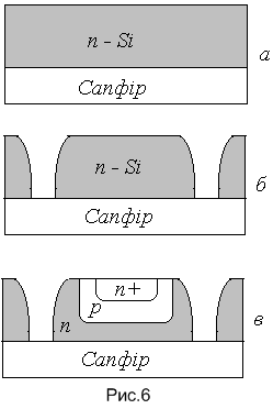 самої поверхні сапфіра (рис.6б). Утворюються ізольовані острівці – кишені, в яких вирощують npn-транзистори (рис.6в).