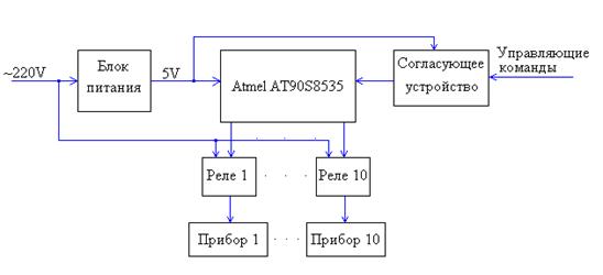 Блок коммутационных реле осуществляет сообщение портов МК и подключенных к нему электроприборов с целью обеспечить при необходимости подачу на прибор питания 220 В, 50 Гц.