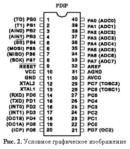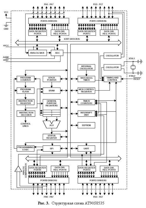 Основным узлом данного устройства является микроконтроллер AT90S8535 фирмы Atmel. Графическое обозначение микроконтроллера приведено на рис 2. AT90S8535 является маломощным, высокопроизводительным 8-ми разрядным микроконтроллером, изготовленным по технологии КМОП на основе AVRRISC архитектуры. МК спроектирован по новейшей технологии Atmel с высокой плотностью интеграции, а также удобной системой команд и набором выводов. В состав однокристального МК AT90S8535 входит:
