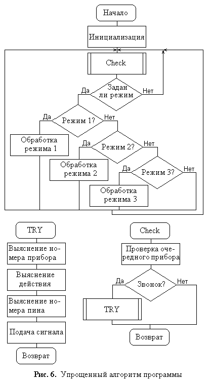 · аппаратной части – представляющей собой коммутацию микроконтроллера, цепи блока питания и интерфейса приёма данных от внешнего устройства, обеспечивающего задание текущего времени, а также режимов работы каждого из подключенных электроприборов.