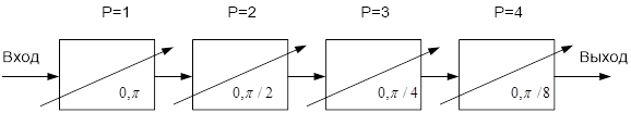 (p=4). С помощью различных комбинаций состояний каскадов фазовращателя может быть реализован любой фазовый сдвиг в пределах от 0 до