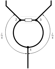 Полосковые делители мощности являются линейными 6-полюсниками СВЧ. В делителе используется параллельное разветвление линий передачи на входе 1, два четвертьволновых трансформатора и поглотитель в виде сосредоточенного резистора с нормированным сопротивлением R=2. Такая схема может быть получена из гибридного кольца.