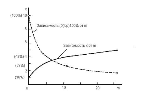Кроме зависимости (10). на рисунке приведена также зависимость относительной избыточности от m. Легко заметить, что с увеличением m требуемый процент избыточности для обнаружения и исправления одиночной ошибки резко уменьшается. Столь неестественный результат является следствием искусственного, далекого от реальности допущения, что в рамках каждого кодового набора независимо от его длины m + x может произойти не более одной ошибки. Если же допустить возможность двух и более ошибок, то задача их обнаружения, и тем более исправления усложняется. Построить для этих случаев коды столь же элегантные, как код Р. Хэммннга для одиночной ошибки, пока не удалось.