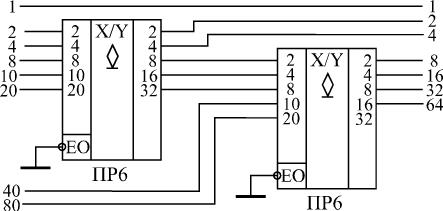 Двоично-десятичный код без младшего разряда на входе ПР6 преобразуется в двоичный код без младшего разряда на выходе ПР6. Младший разряд не участвует в преобразовании, он непосредственно передается со входа на выход. Одна микросхема ПР6 обрабатывает входные коды в диапазоне от 0 (двоично-десятичный код 00 000) до 39 (код 11 1001).