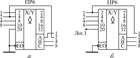 Микросхемы ПР6 имеют выходы ОК. Микросхема ПР6 имеет также вход разрешения выхода -ЕО при нулевом уровне на котором все выходы активны, а при единичном - переходят в состояние единицы. Преобразователь ПР6 имеет дополнительные выходы А, В, С, не участвующие в основном преобразовании.