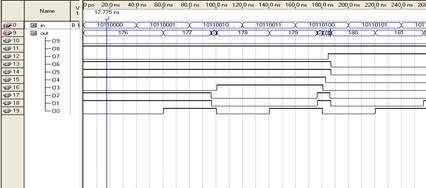 Кроме этого, в среде QuartusII была смоделирована схема. После симуляции были получены временные диаграммы, что свидетельствуют о корректной работе схемы. Схема преобразователя кода готова также для загрузки на учебный стенд.