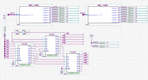 Рис. 7. Схема преобразователя двоичного кода от 0 до 255 в двоично-десятичный код, подготовленная для загрузки на стенд.
