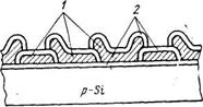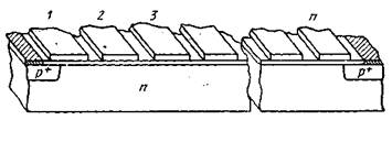Рис.16. Трехтактная структура с перекрывающимися кремниевыми электродами: 1- поликристаллическне электроды; 2 - изолирующий окисел