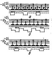 В этой схеме каждый третий электрод подключается к соответствующей шине тактовых импульсов. В исходном состоянии (рис.2,а) под напряжением хранения
