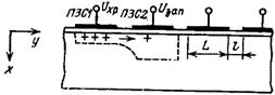 Еще раз отметим, что процессы накопления паразитного заряда определяют максимальное время хранения и минимальную частоту работы цифровых и аналоговые устройств на ПЗС, а также темновые токи в фотоприемных ПЗС. Передача заряда из элемента в элемент осуществляется приложением к соседнему электроду большего по амплитуде напряжения записи Uзап (рис.6). В зазоре между электродами (обозначим его длину через l) возникает тянущее поле, под действием которого дырки перетекают в более глубокую потенциальную яму.