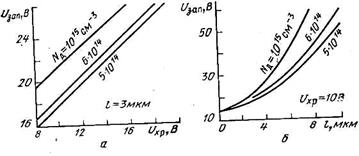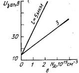 Очевидно, что напряжение записи Uзап должно превышать напряжение хранения Uхр тем значительнее, чем больше расстояние между электродами и чем сильнее легирована кремниевая подложка (рис.7). Из рисунка видно, что практически для работоспособных ПЗС ширина зазора не должна превышать l = 2-3 мкм, aNд≤1015 см-3. Минимальная амплитуда импульса записи Uзап линейно увеличивается при возрастании UXP и QP.