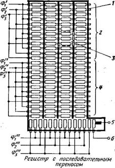 1 - каналоограничивающая диффузионная область; 2 - оптическая секция; 3 - элемент изображения; 4 - секция хранения; 5 - выход видеосигнала; 6 - выходной затвор