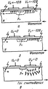 а - режим накопления зарядового пакета; б - перенос зарядов под У-шину; в- инжекция зарядов в подложку при считывании