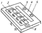 Рис.19. Строка ФСИ на МДП-фотодиодных элементах: 1 - фотодиод; 2 -передающий МДП-транзистор; 3 - вход тактовых импульсов обслуживающего сдвигового регистра; 4 - сдвиговый регистр на МДП-транзисторах; 5 - вход питания; 6- выход видеосигнала.