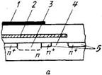 Рис.21. Структура (а) и эквивалентная схема (б) усилителя с плавающим затвором: 1 - тактовый электрод; 2 - плавающий затвор; 3 - потенциальная яма ПЗС; 4 - канал МДП-транзистора; 5 - каналоограничивающие n +-области