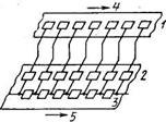 1 - ИК приемники; 2 - буферные элементы; 3 - ПЗС. Направления, а также скорости перемещения ИК изображения (4) и передачи зарядов вдоль ПЗС (5) совпадают.