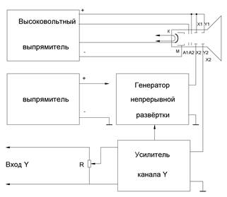 На рисунке 3 представлена функциональная схема простейшего осциллографа, предназначенного для воспроизведения на экране кривых периодических колебаний, подводимых к входу У. Помимо блока питания и ЭЛТ, осциллограф содержит усилитель с несимметричным выходом и генератор непрерывной развертки . Усилитель вертикального отклонения (канала Y) обеспечивает возможность исследования слабых колебаний. Сильные входные сигналы ослабляются с помощью входного потенциометра R ; последний используется также для плавной регулировки размаха (по вертикали) наблюдаемой осциллограммы. Генератор непрерывной развертки вырабатывает напряжение пилообразной формы, которое периодически воздействует на отклоняющие пластины XI, Х2 и заставляет электронный луч перемещаться с постоянной скоростью в горизонтальном направлении, развертывая на экране во времени кривую напряжения, подводимого к пластинам Yl, Y2. Стабилизация частоты повторения пилообразного напряжения на требуемом уровне достигается воздействием на генератор синхронизирующего напряжения, в качестве которого может быть использован сам исследуемый сигнал, подводимый, например, от усилителя канала У. Если амплитуда пилообразного напряжения оказывается недостаточной для развертки изображения в пределах ширины экрана, то на выходе генератора включается широкополосный усилитель .