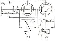 Для исследования периодических процессов с большой скважностью, а также одиночных и непериодических импульсов в состав универсальных и импульсных осциллографов включают генераторы ждущей развертки . В отличие от генераторов непрерывной развертки, они могут неограниченное время находиться в заторможенном состоянии (режиме "ожидания"). Генераторы вырабатывают одиночные импульсы линейного пилообразного напряжения при каждом воздействии на них сигналов запуска; в качестве последних обычно используются исследуемые импульсы или внешние импульсные сигналы, синхронизированные по частоте повторения с исследуемыми. Пилообразные импульсы (с учетом их усиления) должны иметь амплитуду Uпл , обеспечивающую отклонение светового пятна вдоль всей ширины экрана, и длительность tпл , регулируемую в широких пределах. Обычно tпл устанавливается несколько большей длительности исследуемых импульсов tи . При этом благодаря большой скорости развертки кривая исследуемого импульса оказывается растянутой на большую часть ширины экрана, что позволяет детально исследовать её форму и измерить ряд параметров импульса (длительность, амплитуда и др.)