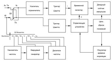 Колебания выбранной (посредством переключателя В2 ) частоты f0 (числовое значение последней является множителем к отсчету по счетчику) с помощью триггера Шмитта преобразуются в прямоугольные колебания с частотой повторения f0 . Под их действием в управляющем устройстве формируется интервальный импульс длительностью Δ t = Т0 = 1/ f0 строго прямоугольной формы. Этот импульс вызывает сброс предыдущих показаний счетчика, а затем (с задержкой на несколько микросекунд) поступает на селектор и открывает его на время Δ t для пропускания импульсов с частотой повторения f x . После закрывания селектора число пропущенных им импульсов m фиксируется индикатором счетчика, а измеряемая частота определяется по формуле f x = m / Δ t .