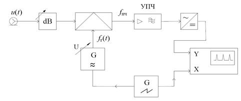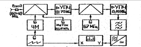 После детектирования огибающая выходного сигнала УПЧ подается на канал вертикального отклонения осциллографического индикатора. Развертка изображения осуществляется пилообразным напряжением, управляющим напряжением первого гетеродина блока ПЧ.