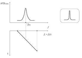 Сигнал с ГКЧ поступает на смеситель. Предположим, что на вход анализатора подан синусоидальный сигнал с частотой fс. Тогда на выходе смесителя возникают колебания с комбинационными частотами, в том числе с разностной частотой fс - fг (t). Сигнал с разностной (и меняющейся во времени) частотой подают на вход узкополосного УПЧ, который и производит процедуру частотного анализа спектра. Закон изменения частоты от времени показан на графике, где для наглядности ось времени повернута вниз.