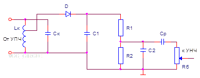 Итак, выбираем последовательный диодный детектор, изображенный на рис.6. Входное напряжение на детектор подается с контура последнего каскада УПЧ (Lк Ск ).