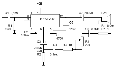 Для обеспечения малых массогабаритных показателей приемника, повышения его надежности, обеспечения требуемых в ТЗ параметров и получения дополнительных возможностей в регулировках используем в качестве УНЧ микросхему К174УН7. Это распространенная ИС, ее применение обосновано как технически, так и экономически.