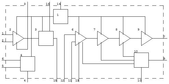 Структурный состав микросхемы приведен в приложении 1. Она состоит из стабилизатора питающего напряжения (1), усилителя радиочастоты (2), смесителя (3), гетеродина (4), четырехкаскадного усилителя промежуточной частоты (6-9), усилителя сигнала АРУ (10).