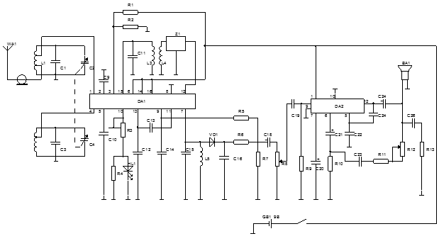 Гетеродин в микросхеме строится на транзисторе VT13. Контур гетеродина подключается как внешний, по отношению к микросхеме, элемент. Усилитель промежуточной частоты состоит из четырех дифференциальных каскадов: первый каскад – транзисторы VT18 и VТ19, второй – VT22-VT23, третий – VT26, VT27; четвертый – VT29 и VT30. Первые три каскада имеют регулируемое усиление. Регулировка осуществляется через диоды VD15-VD20. Управляющий усилением сигнал снимается с транзистора VT31. Этот транзистор совместно с транзисторами VT32-VT34 образует усилитель постоянного тока. Такая схема дает возможность получить глубину регулировки усиления УПЧ более 60 dВ.
